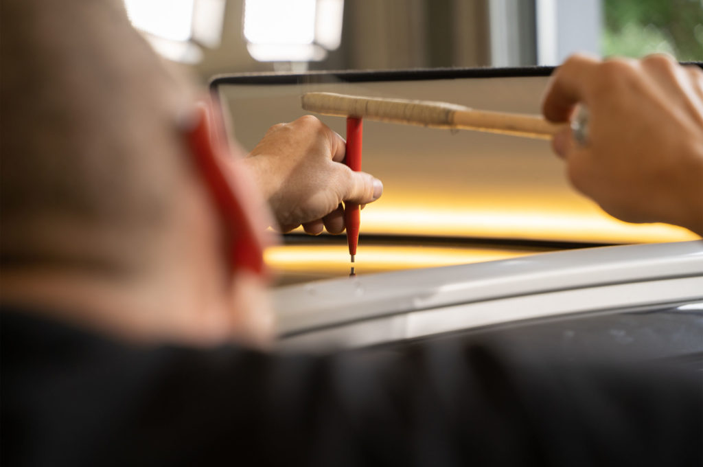 Our technicians use specialized tools to massage the metal back to its original form from behind the panel.